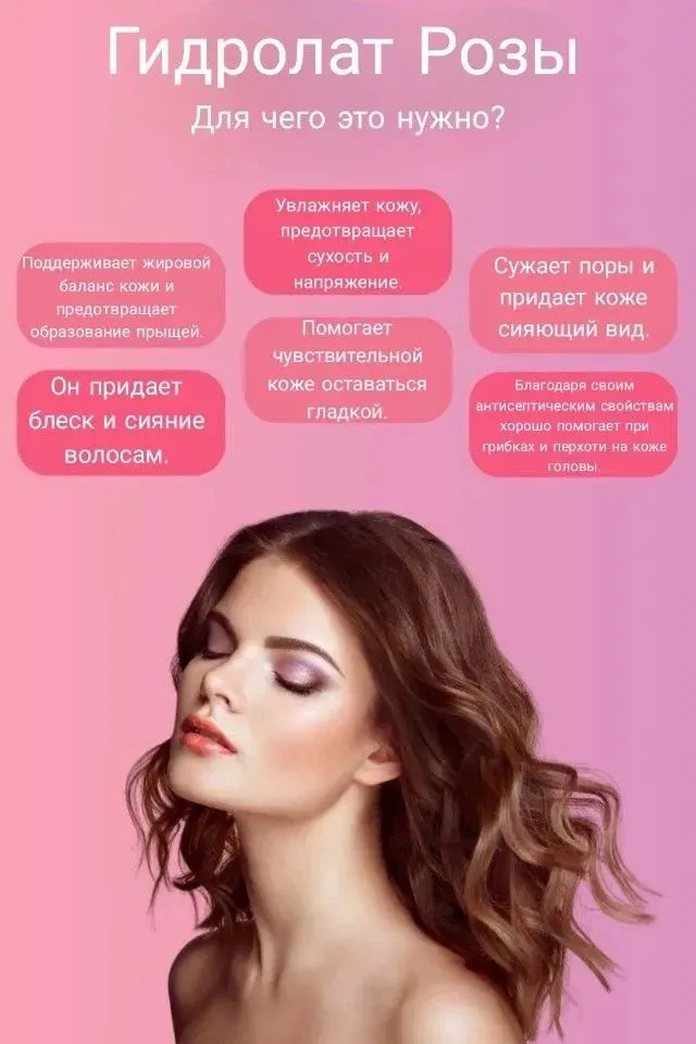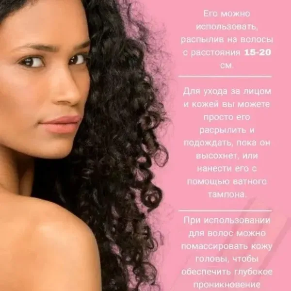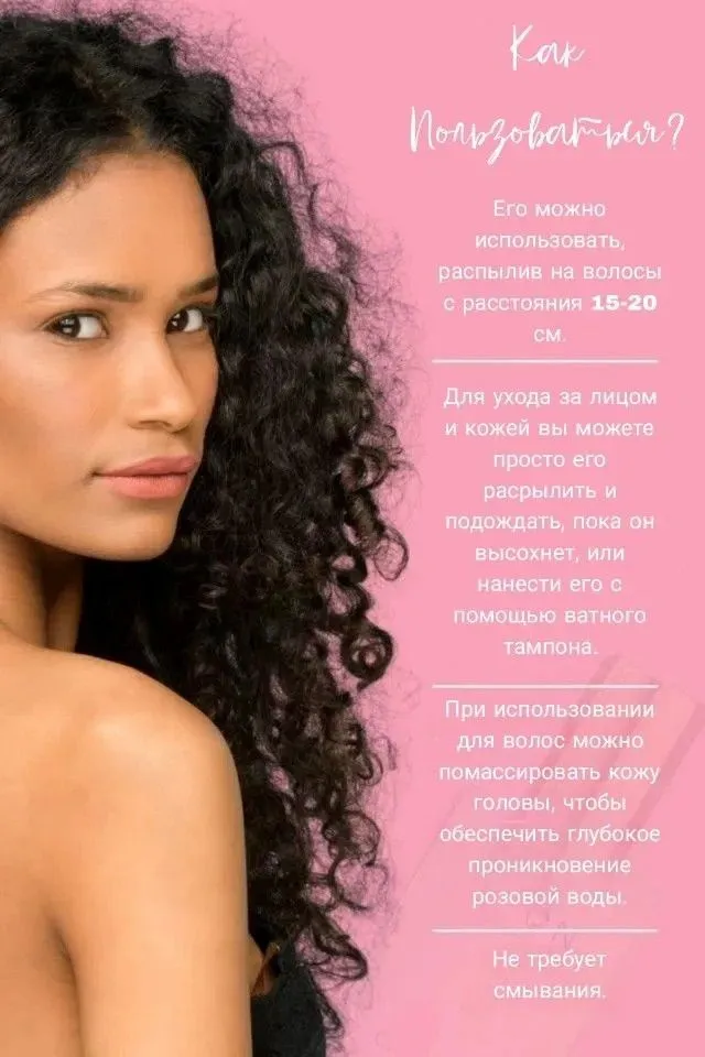 Уход за волосами: Нанесите чистую розовую воду , начиная с кожи головы и заканчивая кончиками волос. Не смывайте.
