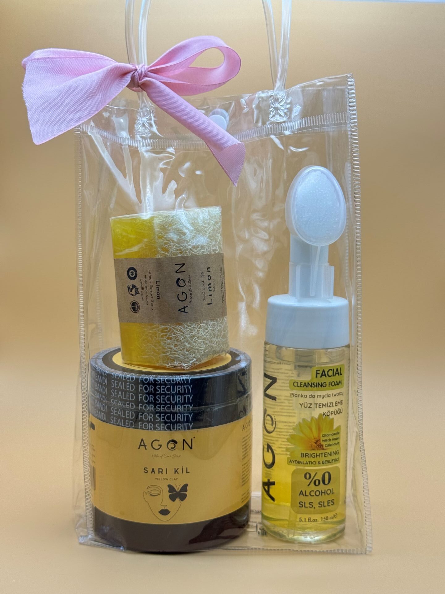 Осветляющий набор с желтой глиной, ромашковой пенкой и лимонным мылом. Улучшает тон кожи и придает сияние.
